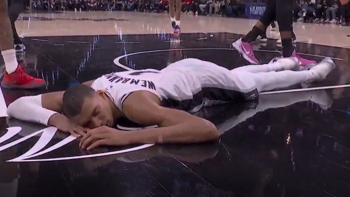 Dói só de ver: Wembanyama bate violentamente com a cabeça no chão e fica desorientado em jogo da NBA