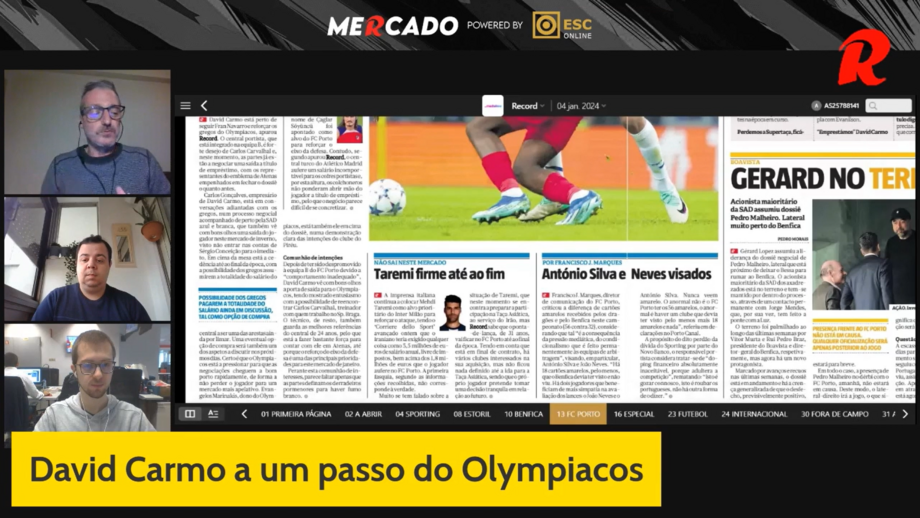 Os jornalistas Record Mário Duarte, André Santos e Bruno Fernandes comentam a situação de David Carmo, prestes a deixar o FC Porto para rumar ao Olympiacos a título de empréstimo.