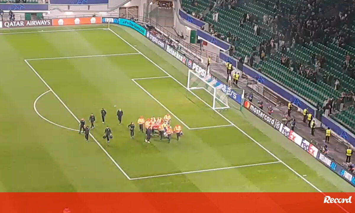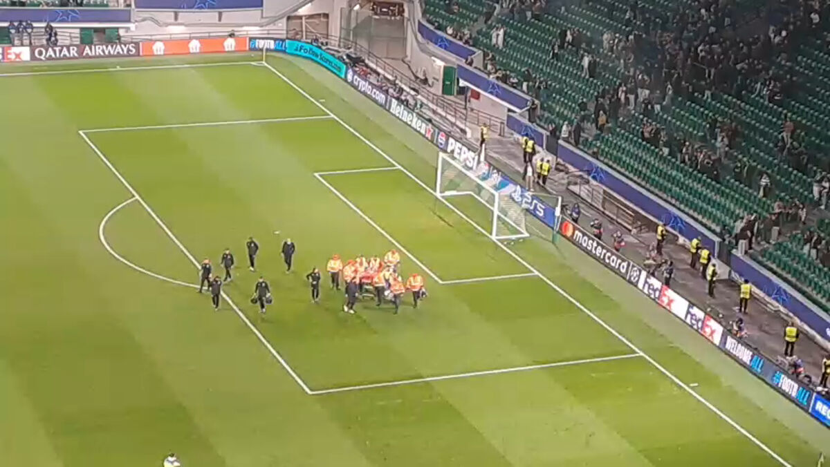 Nordin Jackers, guarda-redes do Club Brugge, saiu de maca no final do jogo em Alvalade após choque com Salvador Blopa.