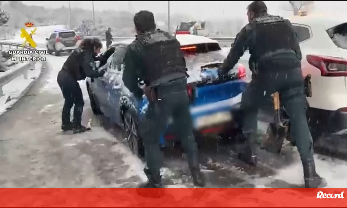 Guardia Civil espanhola ajuda condutores presos na neve em Madrid