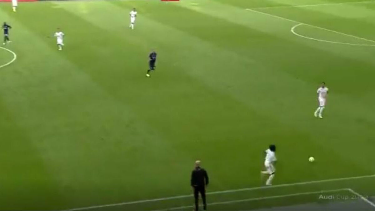 Harry Kane abriu o marcador no jogo entre o Tottenham e o Real Madrid, da Audi Cup, numa jogada em que Marcelo não ficou nada bem na fotografia...