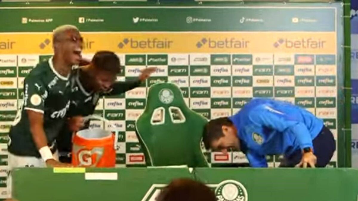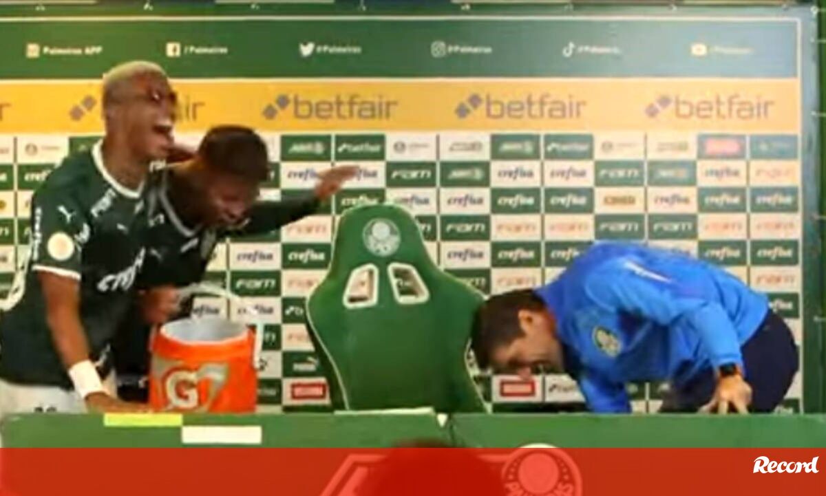 Os jogadores do Palmeiras invadiram a conferência de imprensa de Abel Ferreira, depois do jogo com o Fortaleza, e deram um banho ao treinador. A equipa acabava de obter uma goleada, depois de já ter garantido a conquista do título. (Vídeo Palmeiras/YouTube)