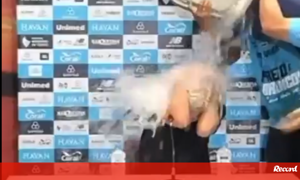 O Grêmio sagrou-se campeão gaúcho depois de ter derrotado o Internacional na final do Estadual e a festa foi rija. As celebrações chegaram mesmo à sala de imprensa, onde o treinador Luís Castro foi surpreendido pelos jogadores com baldes cheios de gelo. Inicialmente, o português não pareceu muito agradado com a ideia, mas lá se juntou à festa. [Crédito: Grêmio]