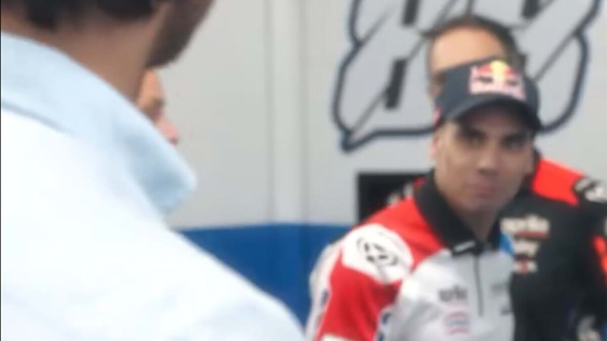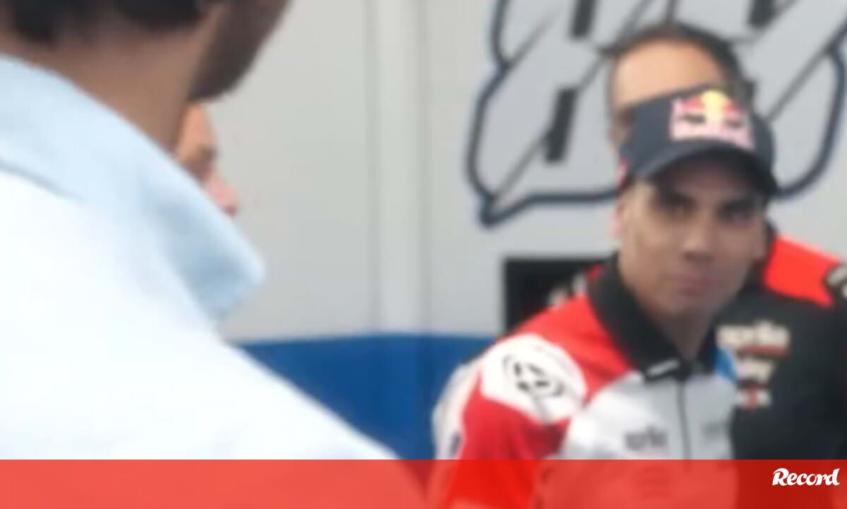 Miguel Oliveira foi surpreendido esta sexta-feira, entre uma das duas sessões de treinos para o Grande Prémio da Catalunha, pela visita de João Sousa. A cara do piloto da Trackhouse Racing diz tudo...