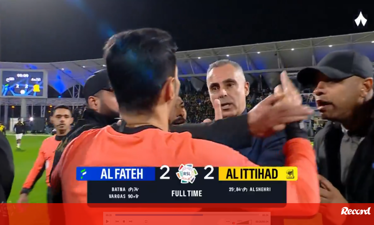 Após o Al Fateh empatar em casa (2-2) com o Al Ittihad de Sérgio Conceição, José Gomes protagonizou um momento de enorme tensão ainda no relvado. O treinador da equipa visitada tentou confrontar o árbitro do encontro, mostrando-se muito indignado com a sua prestação. Alguns elementos da sua equipa técnica tentaram deter o português - sem sucesso - e só mesmo a segurança o conseguiu travar, já depois de este trocar palavras pouco amistosas com o juiz. Ao que Record apurou, José Gomes queixa-se de que a falta que origina o penálti assinalado contra a sua equipa foi fora de área e que houve vários foras de jogo marcados sem esperar pela revisão do VAR. [Crédito: Thmanyah Sports]