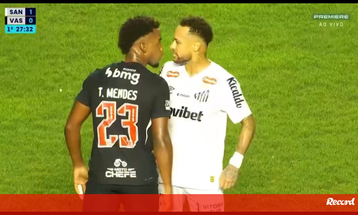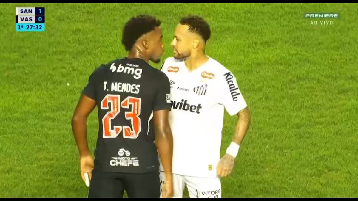 Neymar brilhou com um na vitória (2-1) do Santos frente ao Vasco, mas também protagonizou um momento de tensão. O camisola 10 teve um desentendimento com Thiago Mendes e, na flash interview ao intervalo, não poupou nas palavras para descrever o adversário, com quem já se tinha envolvido em confusões quando se cruzaram no campeonato francês. [Crédito: Globo Premiere]