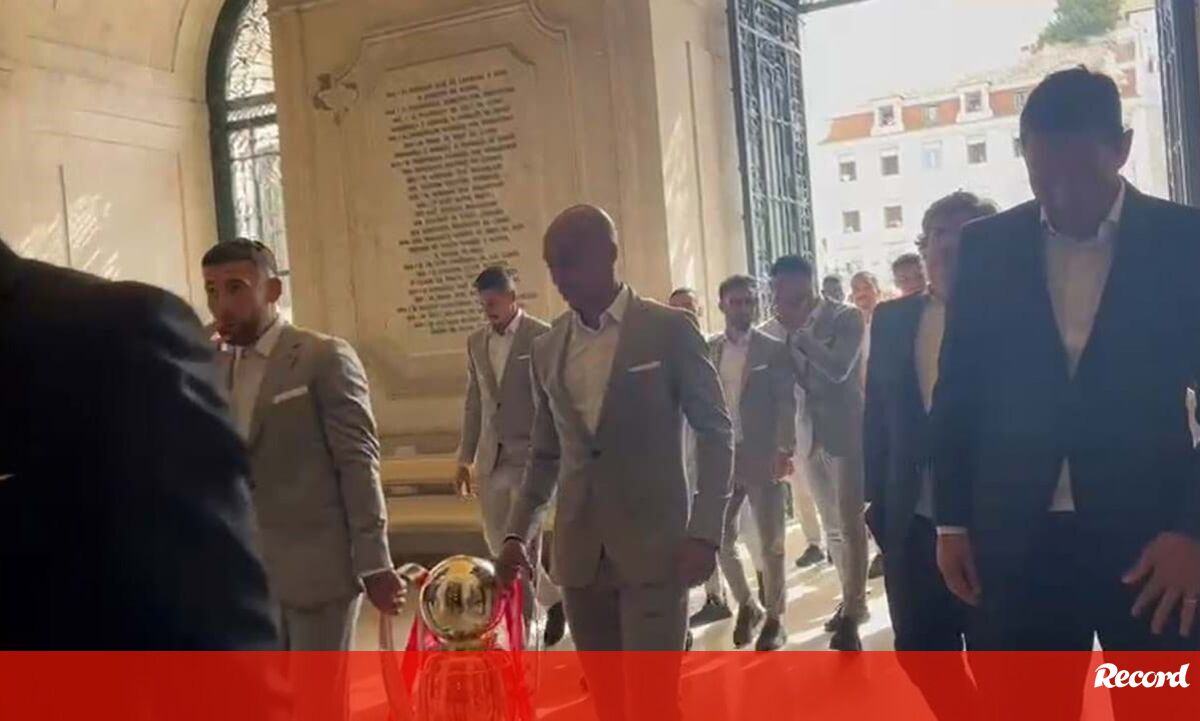 O momento em que a comitiva do Benfica entrou na Câmara Municipal de Lisboa, pouco antes de tirar uma fotografia com Carlos Moedas, presidente da Câmara de Lisboa, e com a taça de campeão, nas escadarias dos Paços do Concelho.