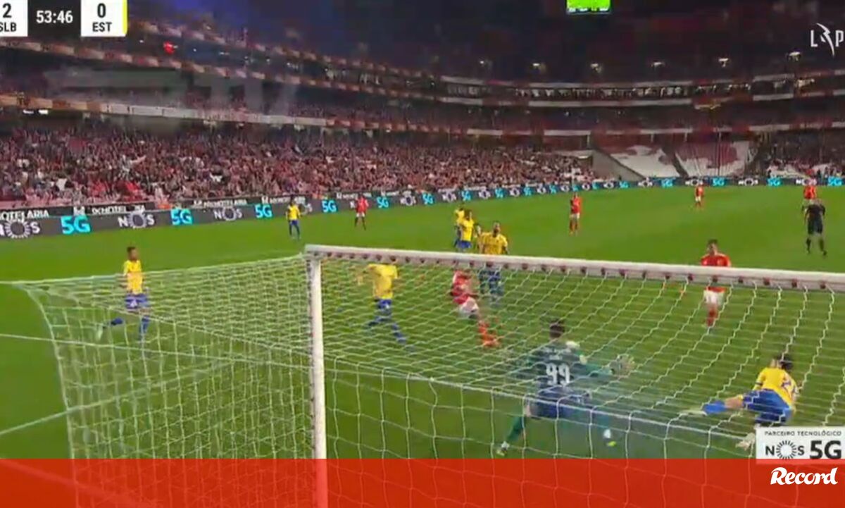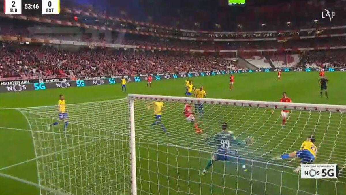 Aos 53' do Benfica-Estoril, Gonçalo Ramos fez o 2-0 para as águias após passe de Gilberto.