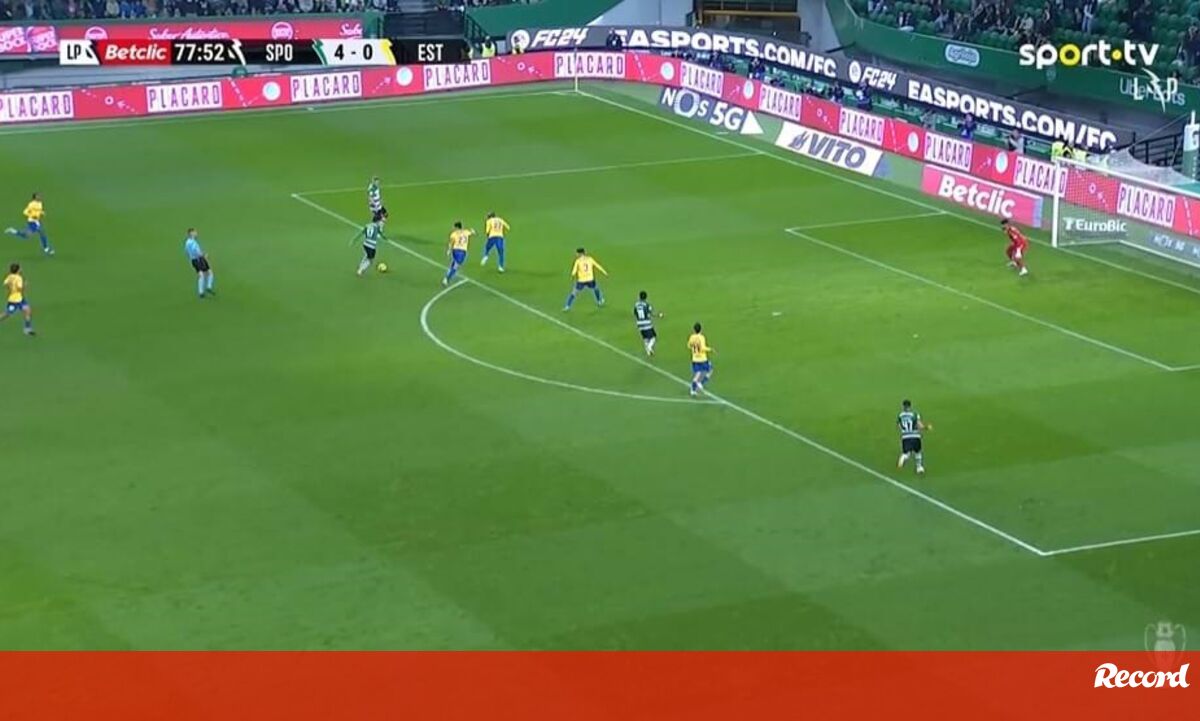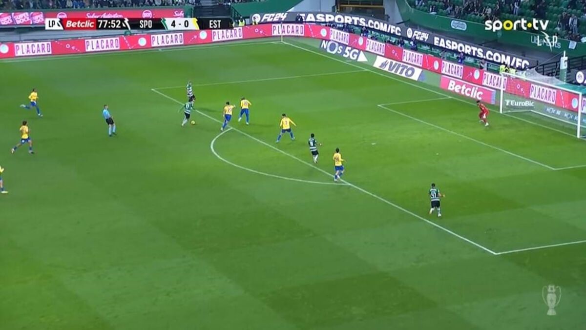 Aos 78' do Sporting-Estoril, Trincão fez o 5-0 para os leões com um remate colocado de fora da área.