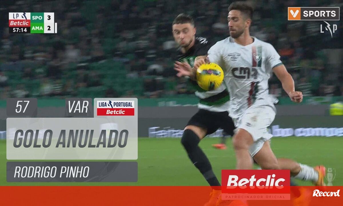 Aos 58' do Sporting-Estrela, Rodrigo Pinho bisou e fez o que seria o 3-2 mas o lance foi anulado pelo VAR por mão na bola do avançado dos amadorenses.