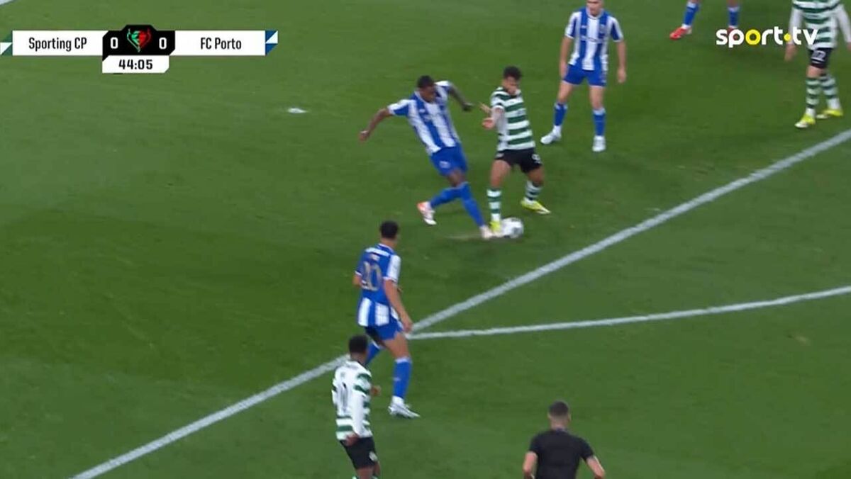 Aos 43' do Sporting-FC Porto, os leões pediram penálti de Pablo Rosario sobre Luis Suárez mas o árbitro Cláudio Pereira e o VAR mandaram jogar.