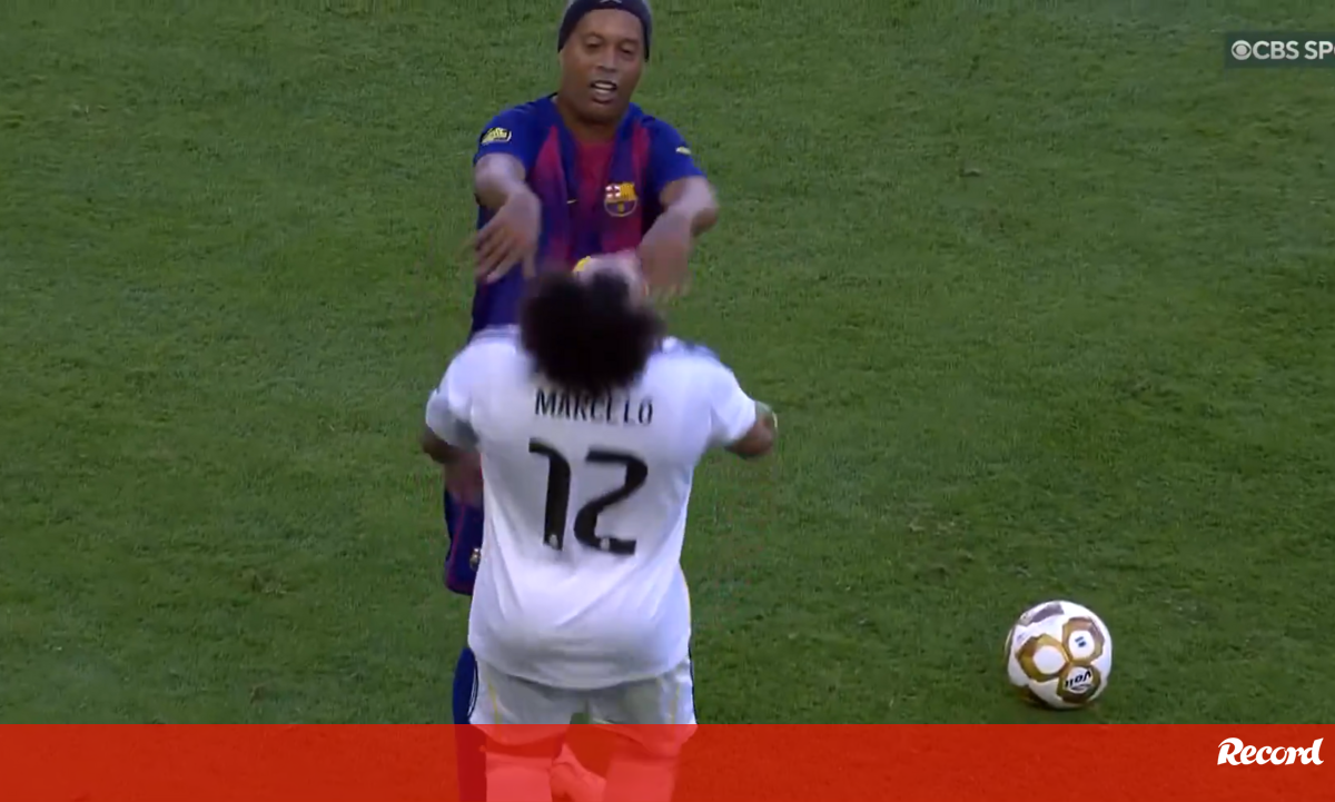 Este domingo, disputou-se em Los Angeles um clássico Real Madrid-Barcelona entre lendas de ambos os clubes. Embora seja um jogo de exibição, há quem não deixe de o levar a sério e houve um momento em que Marcelo e um adversário ficaram a reclamar sobre uma falta. Aí, surgiu Ronaldinho que 'empurrou' Marcelo para resolver a disputa, num momento de grande animação. [Crédito: CBS Sports]
