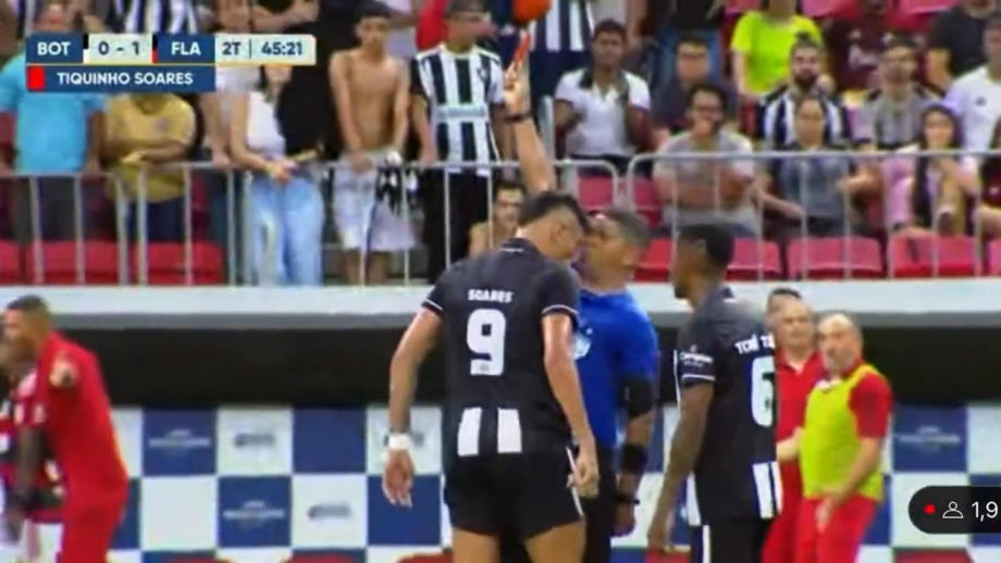 Tiquinho Soares, antigo avançado do FC Porto, protagonizou este sábado, no duelo entre Botafogo e Flamengo (0-1), um momento lamentável. O brasileiro foi expulso já na compensação e, quando lhe foi mostrado o cartão vermelho, dirigiu-se ao árbitro e agrediu-o com uma cabeçada. (Vídeo: Twitter)