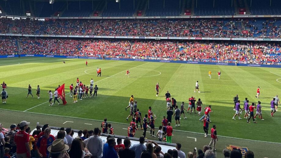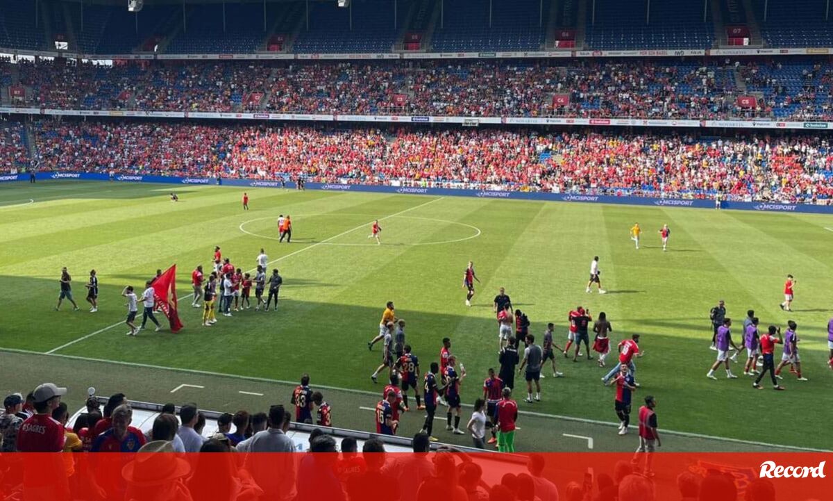 Após o apito final do jogo entre o Basileia e o Benfica (1-3), vários adeptos das águias invadiram o relvado para irem ao encontro dos jogadores e tentarem ficar com uma recordação.