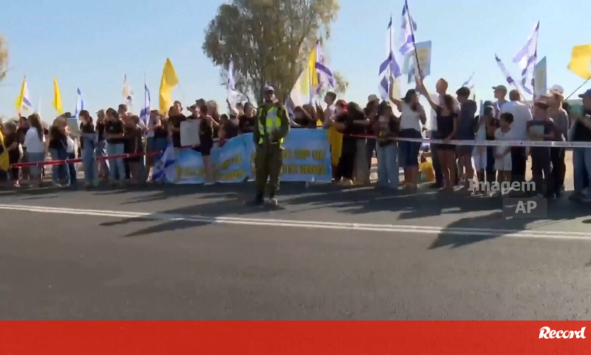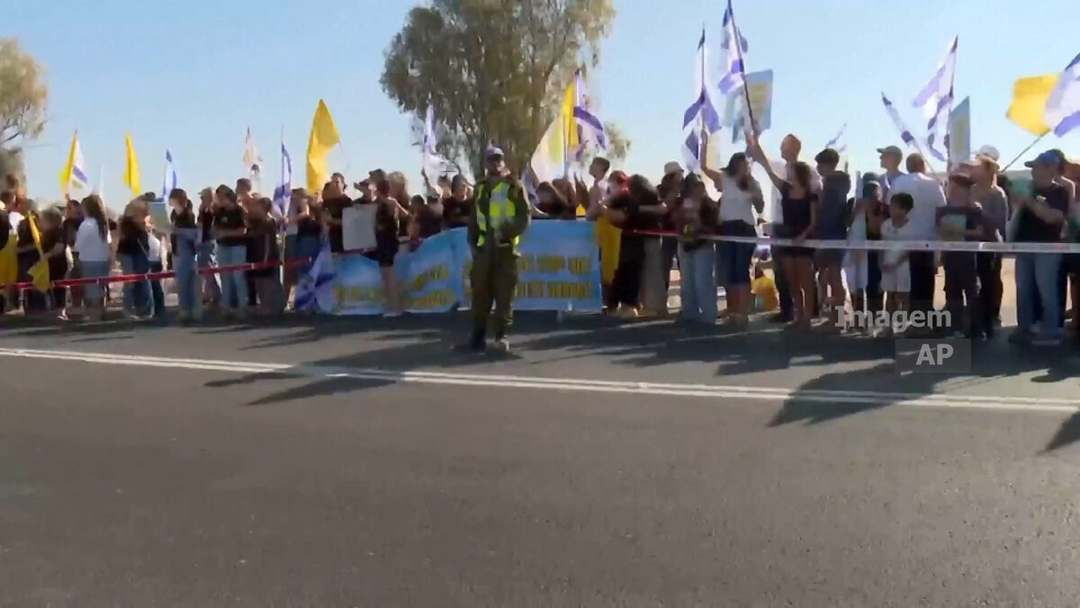 Centenas de israelitas fazem a festa nas estradas que levam à base militar de Reim, onde os reféns libertados serão levados depois de chegarem a Israel.