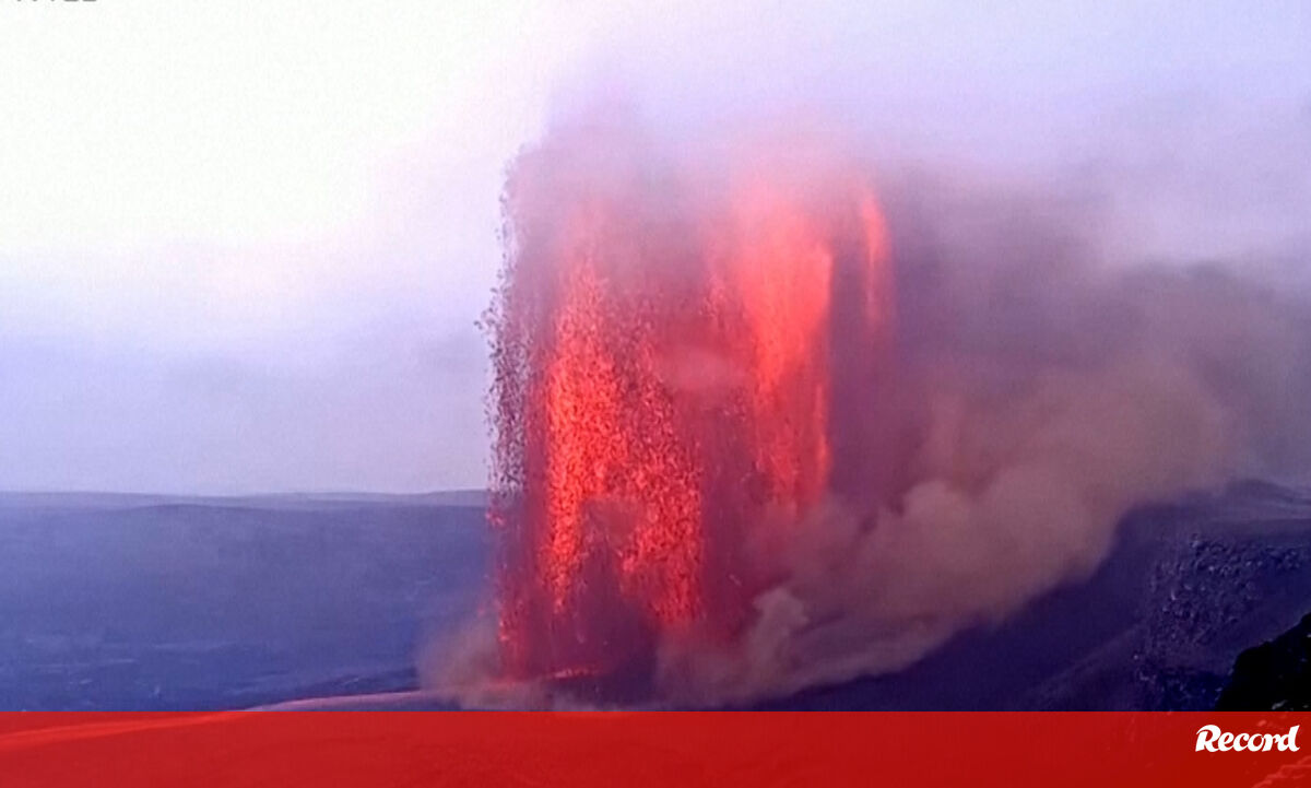 erupção, no domingo à tarde, lançando nuvens de cinza e lava. Este é um