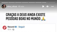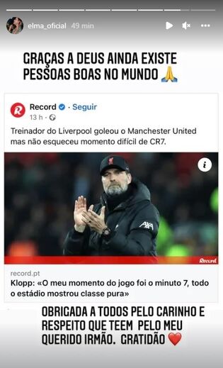 "Graças a Deus ainda existem pessoas boas no Mundo. Obrigada a todos pelo carinho e respeito que têm pelo meu querido irmão. Gratidão", escreveu Elma, numa publicação onde mostra uma notícia de Record.