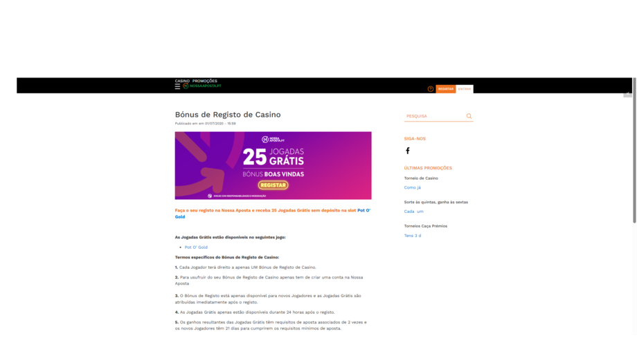 No momento do registo recebes 25 jogadas grátis para utilizares na slot Pot O’ Gold e não necessitas de um depósito para reclamar as jogadas. As mesmas estão disponíveis durante 24h após o registo.