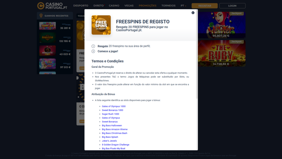 No Casino Portugal a oferta é bastante simples e não requer qualquer depósito para a resgatar. São 20 jogadas grátis que podem ser usadas numa boa seleção de máquinas e que estão disponíveis durante 24h após o registo. Um ponto positivo nesta oferta é que os ganhos resultantes destas jogadas grátis não têm requisitos e podem ser levantados de seguida.
