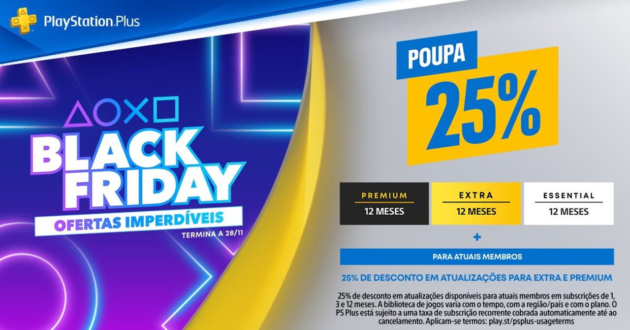 PlayStation®Plus Extra: inclui as mesmas vantagens do nível PlayStation®Plus Essential e ainda um catálogo até 400 dos melhores títulos para a PlayStation®4 e para a PlayStation®5, contando os grandes êxitos dos PlayStation Studios e outras grandes editoras. Neste nível, os jogos são transferíveis. Durante a Black Friday, a subscrição de 12 meses estará disponível por apenas 74,99€ em vez dos habituais 99,99€;
