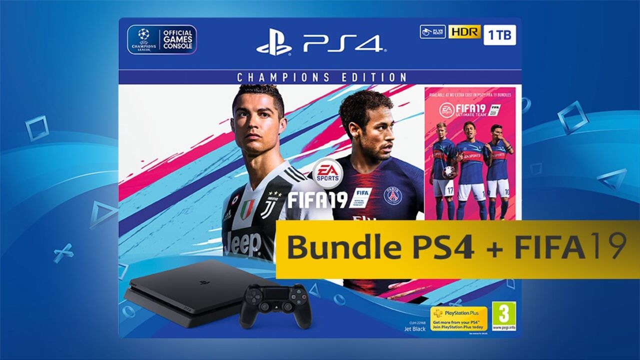 No dia 28 de setembro, data a partir da qual o FIFA 19 estará à venda, será lançado outro bundle que, além da consola PS4™ de 1TB, inclui um comando wireless Dualshock 4 e ainda um disco Blu-ray com o FIFA 19 Edição Standard. Este bundle estará disponível por um preço estimado de 299,99€, o que também se traduz num desconto de 50€ sobre o seu preço original fora do período da campanha.