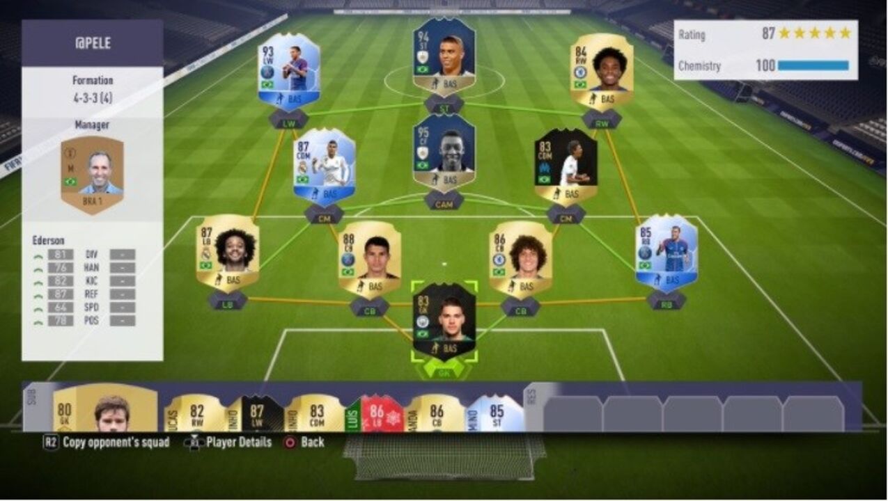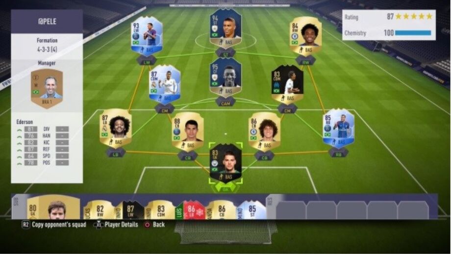 Na baliza temos Ederson, seguido por uma linha defensiva composta por Daniel Alves, Thiago Silva, David Luiz e Marcelo. Mais na frente o miolo conta com Casemiro, Luiz Gustavo e o próprio Pelé. Na frente, um tridente de luxo composto por Neymar, Ronaldo "Fenómeno" e William.
