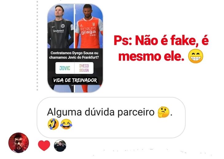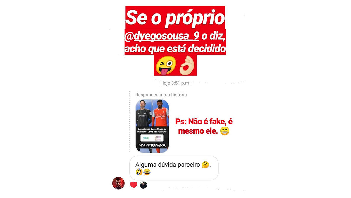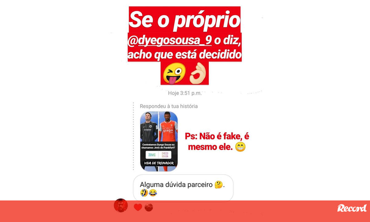 Quando perguntava aos seus seguidores sobre se a melhor opção para o Benfica seria resgatar de empréstimo Luka Jovic ou contratar Dyego Sousa, foi o próprio jogador a responder no Instagram.