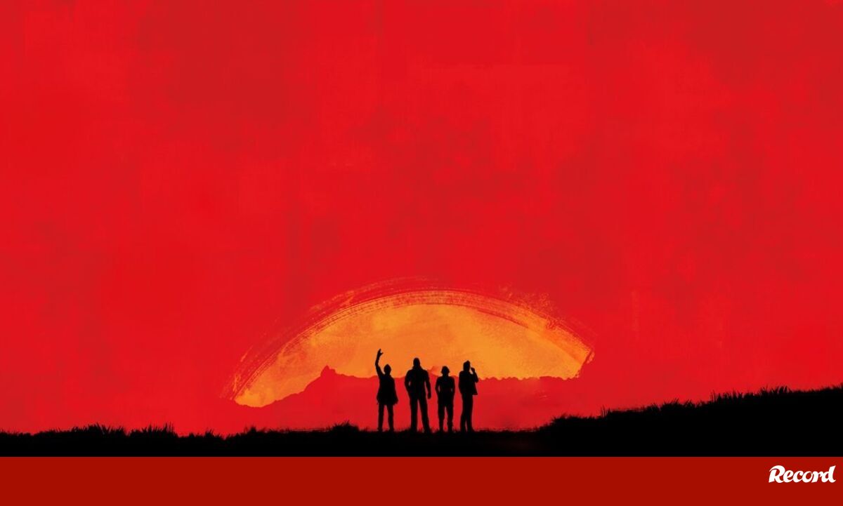 Na imagem é possível ver a a silhueta de Noctis ao lado do restante grupo de protagonistas de Final Fantasy XV, com o fundo do Red Dead.