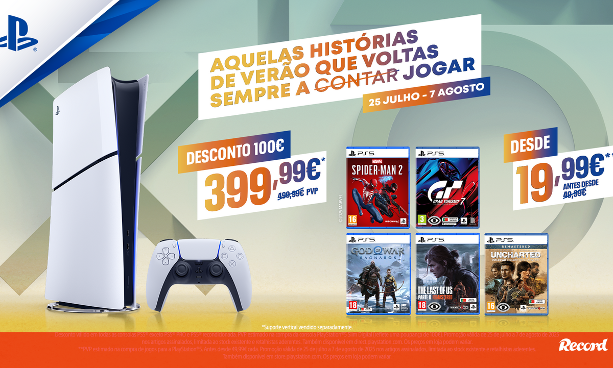 A Sony Interactive Entertainment (SIE) anuncia novas ofertas para a promoção "Promoções de Verão" da PlayStation®, desta vez em lojas físicas e pontos de venda habituais. Entre 25 de julho e 7 de agosto, jogadores de todas as idades poderão desfrutar das histórias de verão que voltam sempre a contar jogar, com promoções em consolas PlayStation, como o desconto de 100 euros na Edição Digital da PlayStation®5, incluindo bundles, bem como em grandes títulos como Marvel’s Spider-Man 2, Gran Turismo 7, God of War: Ragnarök, entre outros.
