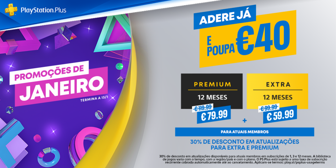 A Sony Interactive Entertainment (SIE) convida todos os jogadores a aproveitarem os últimos dias da promoção nas subscrições do PlayStation®Plus que foi anunciada recentemente. Isto significa que até dia 13 de janeiro, aqueles que aderirem ao PlayStation®Plus e não tiverem uma subscrição ativa no momento, poderão continuar a desfrutar de descontos nas modalidades de 3 e de 12 meses das subscrições Extra e Premium. Uma subscrição de 12 meses do PlayStation®Plus Extra, por exemplo, custa apenas 59,99€ na PlayStation®Store até sexta-feira. Já uma subscrição de 12 meses do PlayStation®Plus Premium custa apenas 79,99€ em vez dos habituais 119,99€ até lá.