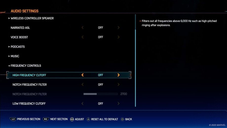 Outras opções adicionais de acessibilidade incluídas em Marvel’s Spider-Man 2 são também os controlos de frequência de áudio que, segundo Michele, "permitirão aos jogadores desativar sons incómodos/ desconfortáveis com a Eliminação de Altas Frequências (como um zumbido agudo), ou a Eliminação de Baixas Frequências (como os graves de uma explosão), ou fazer uma configuração personalizada com o Ajustar Filtro de Frequência para que possam desfrutar melhor das piadas clássicas do Pete enquanto lança uma granada que está pronta a explodir".