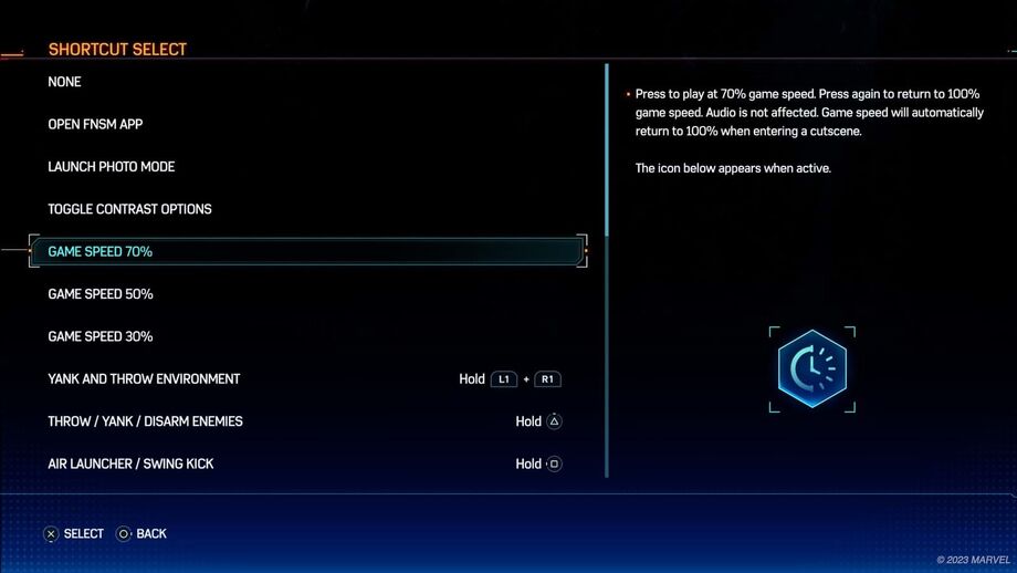 O aguardado título da Insomniac Games que chegará em exclusivo à PlayStation®5 no próximo dia 20 de outubro, contará ainda com duas opções que o estúdio e a comunidade adoram: Atalhos e Velocidade de Jogo. "Os nossos atalhos permitirão aos jogadores atribuir uma variedade de opções aos botões de direção esquerdo ou direito. Se tiveres dificuldade em pressionar vários botões ao mesmo tempo, se quiseres uma forma rápida de ativar ou desativar as opções de jogo de Alto Contraste, ou mesmo se quiseres abrir o Modo Foto pressionando num único botão, podes atribuí-los aos botões direcionais esquerdo ou direito para uma utilização rápida durante o jogo", disse Michele Zorrilla do estúdio. E acrescentou: "Introduzido em Ratchet & Clank: Uma Dimensão à Parte e agora presente em Marvel's Spider-Man 2, os jogadores poderão atribuir velocidades de jogo de 70%, 50% e 30% da velocidade real aos botões de atalho. Isto permitirá desacelerar a ação, dando-lhes mais tempo para reagir a vários cenários de jogo".