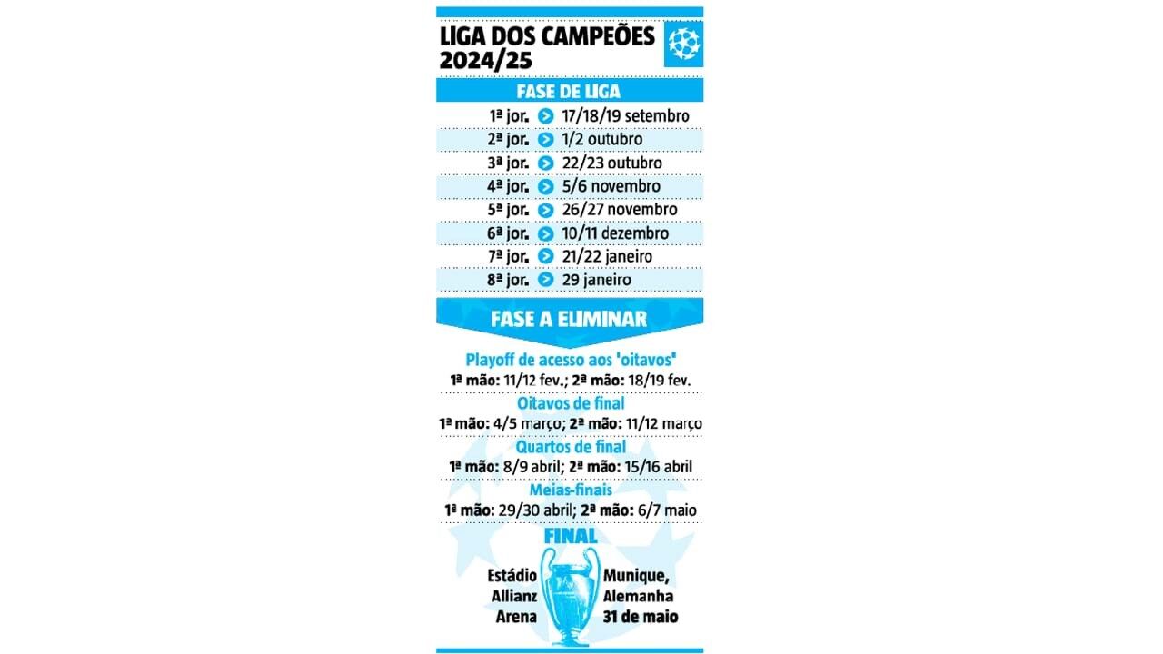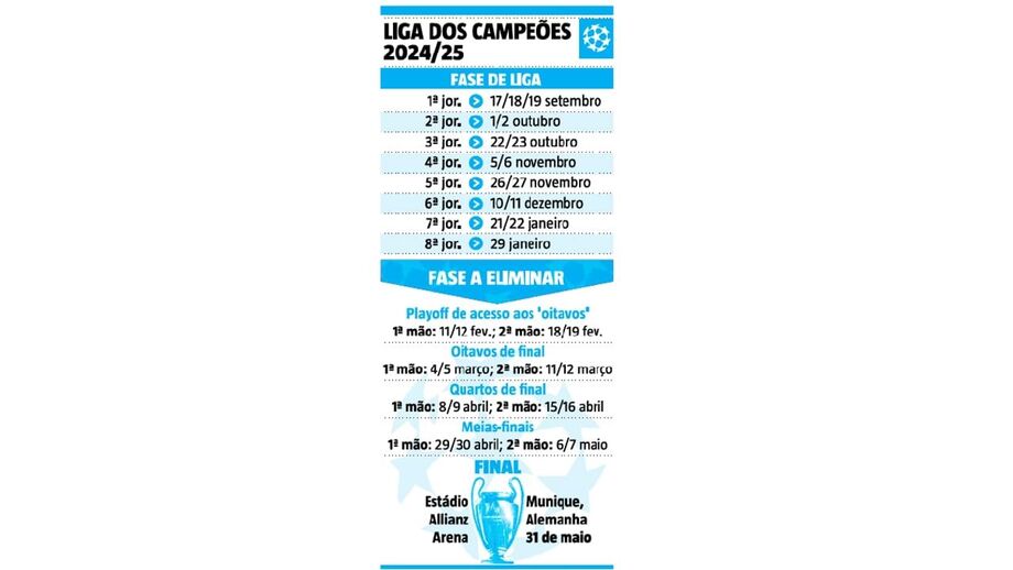 Nota ainda para o aumento dos prémios que a UEFA irá distribuir pelos participantes, no valor total de 3,3 mil milhões de euros (2,4 mil milhões só na Champions). Os prémios por vitória descem de 2,7 M€ para 2,1 M€, mas os de participação sobem 3 M€ para 18,6 M€ e há extras para quem terminar entre o 1.º e 16.º lugares. Para o vencedor há um total de 96,2 M€ só pelo desempenho desportivo!