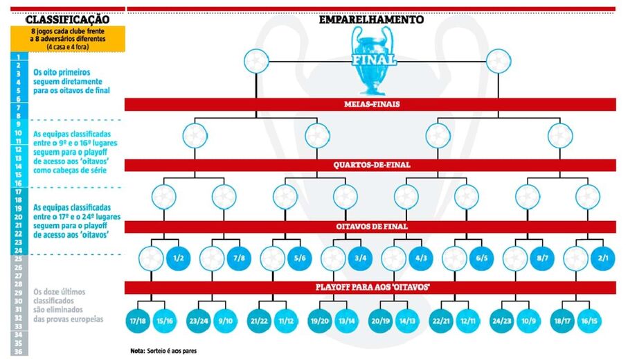 Agendado para dia 29, no Mónaco, o sorteio – com Benfica no pote 2 e Sporting no 3 – deixará de ser feito ‘à mão’. Agora, as bolas dos clubes serão retiradas dos potes apenas uma vez e, a partir daqui, será um computador a definir os adversários através de um algoritmo, facilitando o cumprimento dos vários critérios. Segundo a UEFA, efetuar o sorteio da nova Champions nos moldes antigos levaria a que o mesmo durasse 4 horas e fossem necessárias mais de... 900 bolas! "O primeiro passo do sorteio ainda é físico, alguém irá tirar uma bola de uma taça. No entanto, temos agora 36 equipas que precisam de oito adversários sorteados. Teríamos de preparar bolas para todos os possíveis adversários...", explicou Stéphane Anselmo, responsável pelo desenvolvimento estratégico das competições, adiantando uma previsão para o número de pontos mínimo que permita o apuramento para a fase seguinte: "Simulámos que a qualificação seria possível com média de 7,6 pontos, isto é, duas vitórias e dois empates."