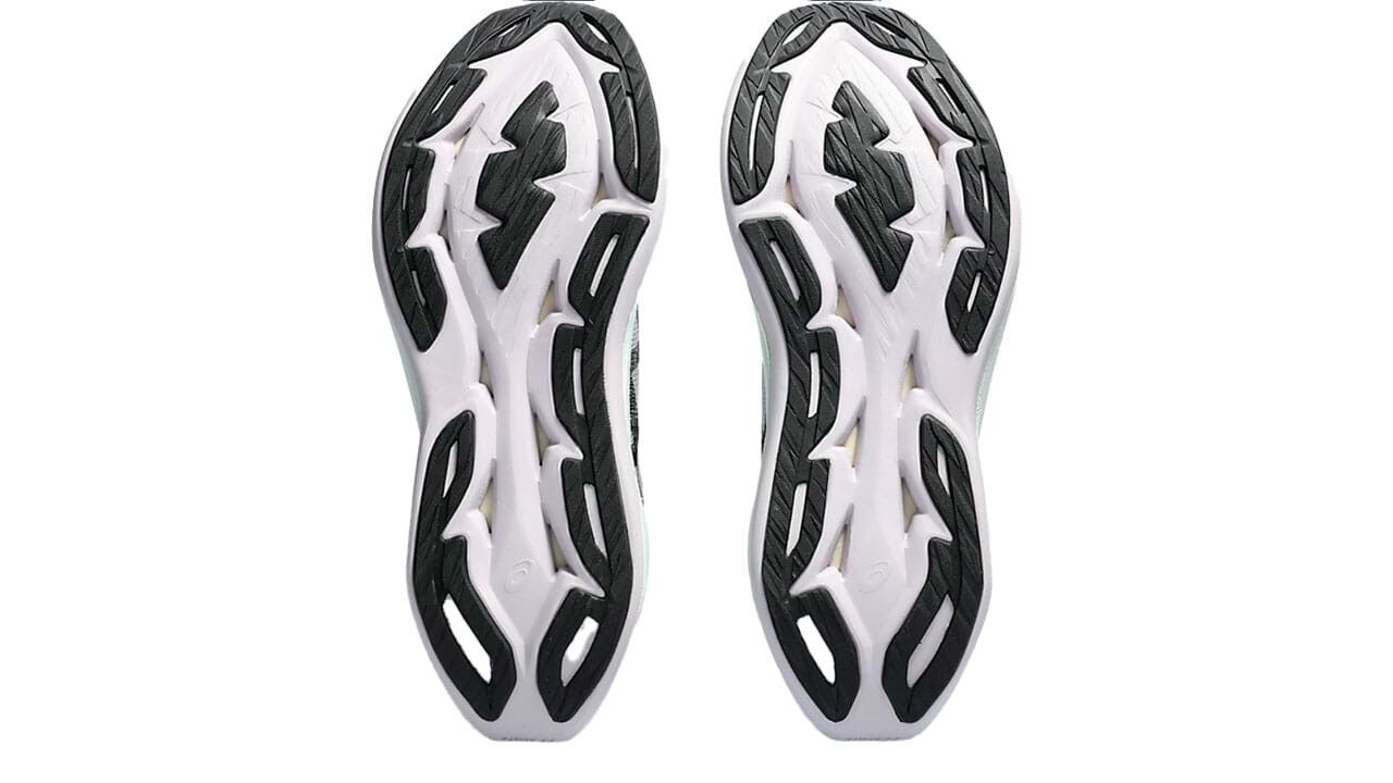 E já que falamos na durabilidade, vamos já à sola, que conta com um composto que a ASICS tem feito questão de apontar como estrela, o AHAR+. E aqui também reside um aspeto interessante das sapatilhas, pois de forma a reduzir no peso, mas também aproveitando o facto de ter um modelo maximalisma - com imensa espuma na meia-sola -, a marca japonesa tratou de fazer alguns buracos na sola. Isso reduz no peso, algo que se nota, mas não compromete na durabilidade, pois com quase 200 quilómetros estão praticamente intactas. O único problema será mesmo o facto desses mesmos buracos 'chamarem' alguns detritos...