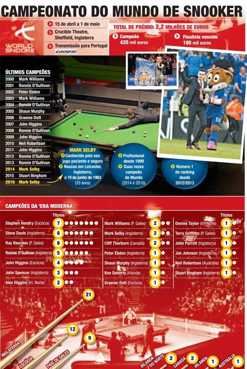 O evento anual mais aguardado e importante do snooker, o Campeonato do Mundo, dá as primeiras tacadas já nesta quarta-feira, dia 15, e só vai terminar no próximo dia 1 de maio, com a competição a decorrer no Crucible Theatre, em Sheffield, Inglaterra, placo desta competição desde 1977, há precisamente 40 anos, e com acordo para a receber até 2027. Com transmissão televisiva para Portugal via Eurosport, este é um evento que terá uma audiência estimada de 400 milhões de telespectadores.