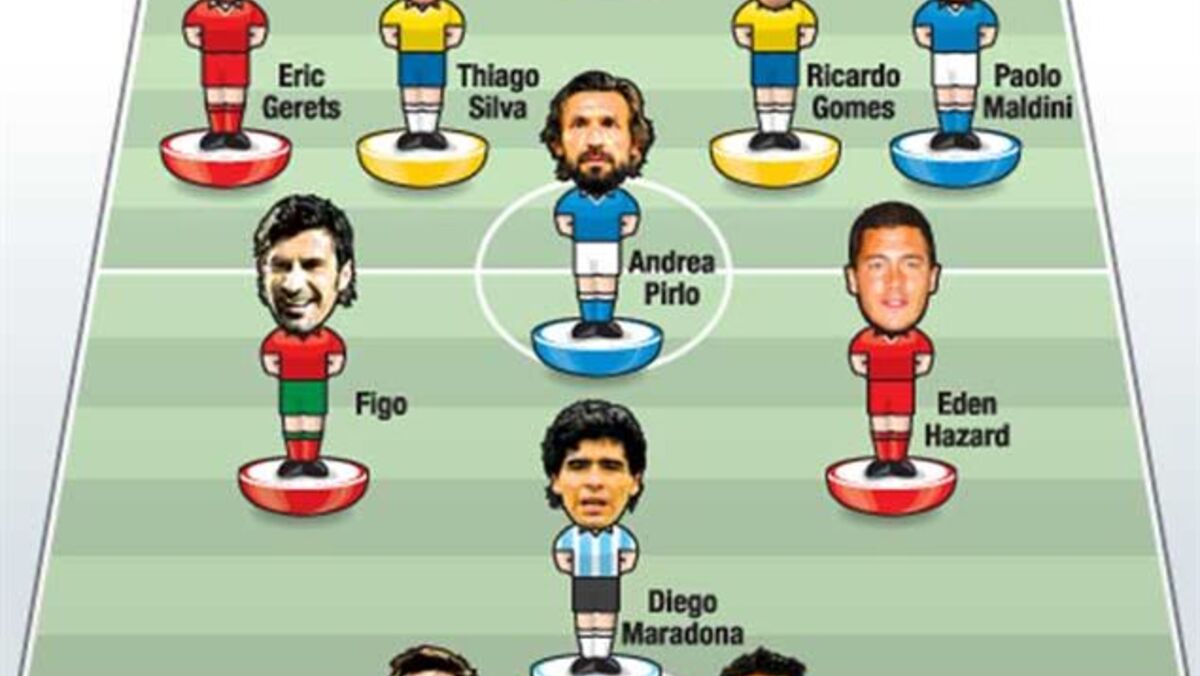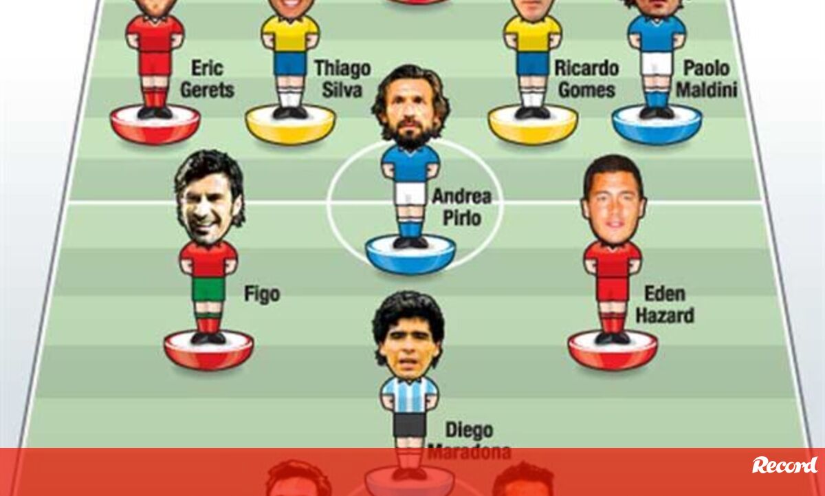 Mais um belga, Hazard, no meio-campo, e o italiano Pirlo, a acompanhar os históricos Figo e Maradona. Na frente, os inevitáveis Messi e Ronaldo.
