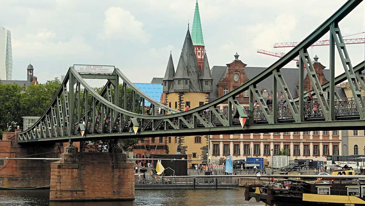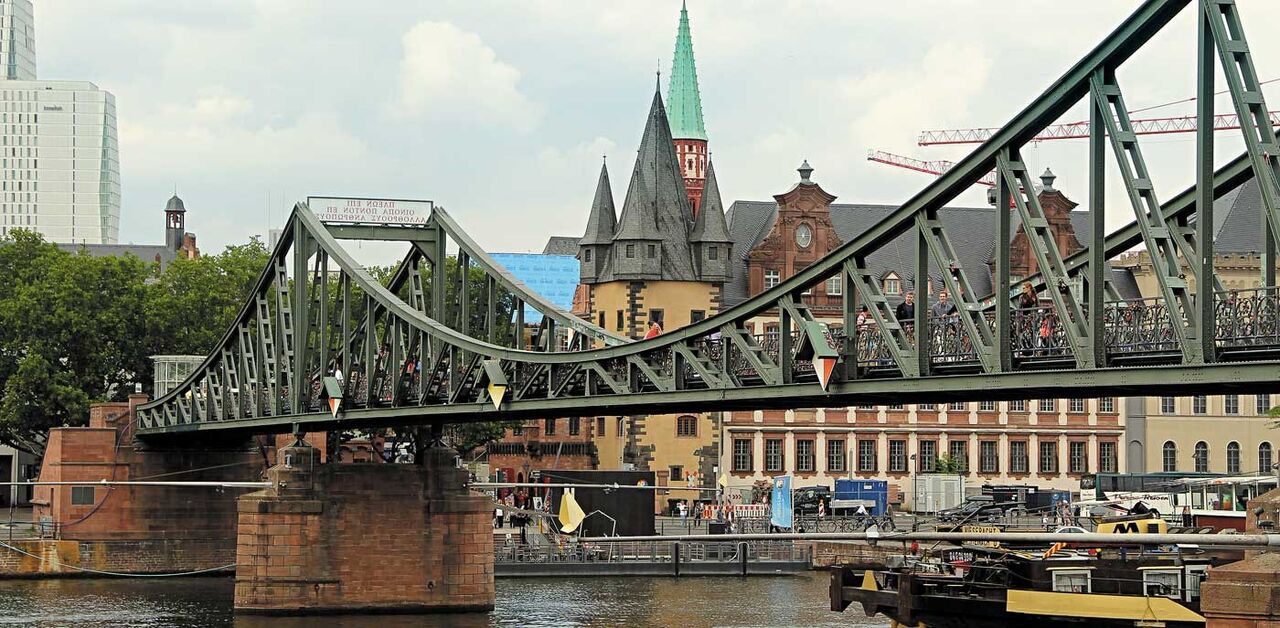 A umas centenas de metros aparece o rio Meno, que banha a cidade de Frankfurt. E aqui destaca-se também a bela ponte de ferro, a Eiserner Steg, que é pedonal e da qual é possível ter uma bela vista sobre os arranha céus da cidade moderna e apreciar todo o bucolismo junto ao rio.
