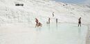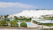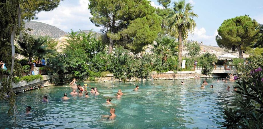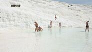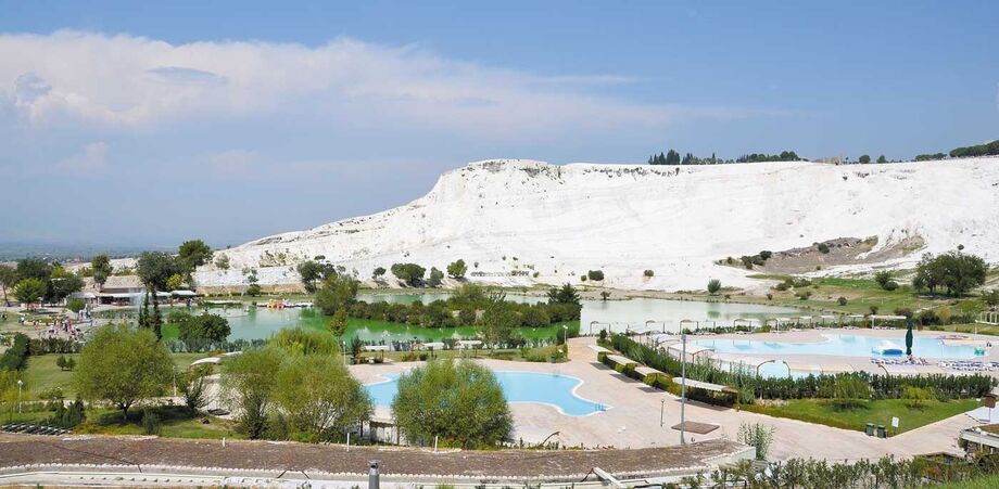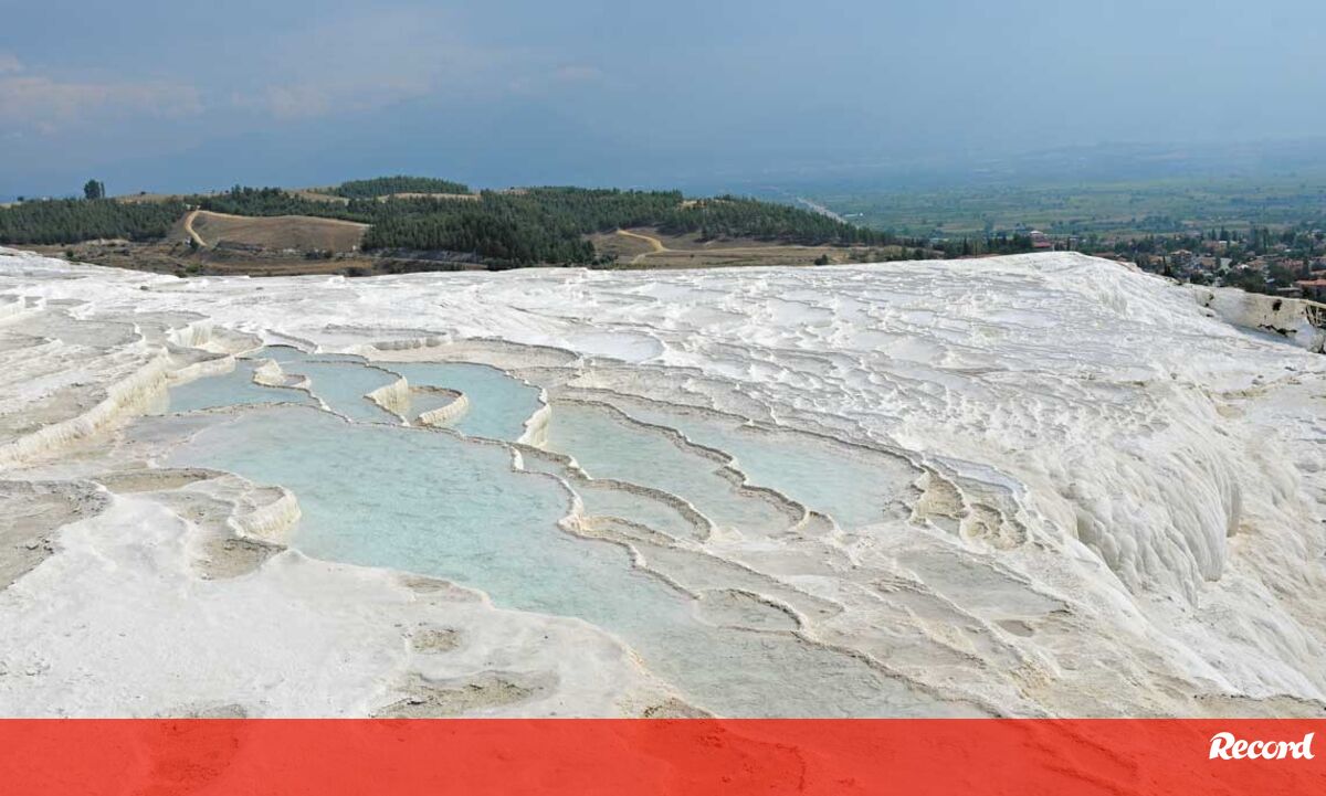 A vista da entrada do parque natural é absolutamente única. Pamukkale, que em turco significa castelo de algodão, parece saído de um cenário encantado. Uma montanha gigante, ‘pintada’ de branco, com piscinas naturais e água a escorrer encosta abaixo, pode transportar-nos para outros sonhos. A água é quente, muito – a temperatura pode situar-se entre os 35 e os 50 graus.